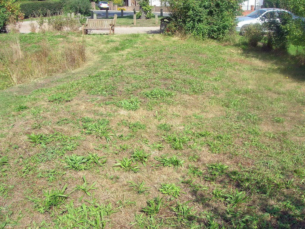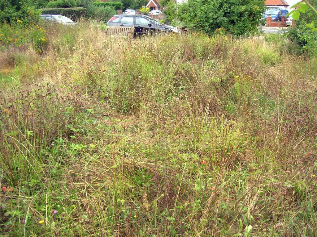 When the area is mown, the cuttings are collected and removed to reduce the amount of nutrients rotting back into the soil. This is vital for the health of the herbaceous wildflowers and grasses that require relatively nutrient poor soils. If this were not done the area would quickly be taken over by nettles and brambles. The area near the back by the garage has never been cut, though this is deliberately left to act as winter refuge for wildlife such as amphibians and small mammals, and because it was planted with wild roses. The whole area would look like this if it was not managed in the way that it is.
