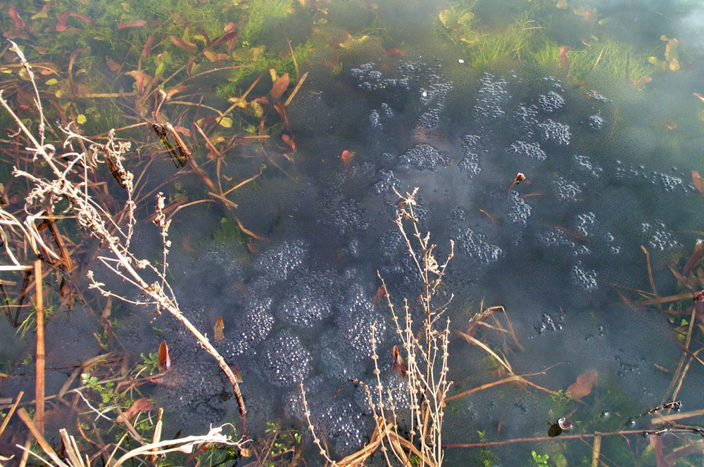Nowadays, toads, frogs, and Smooth Newts all breed in the pond and can be seen throughout the year if you know where to look. One pleasantly surprising colonizer of the area, both pond and grassland, has been the Grass Snake, because a female has now successfully raised her young here every year since 2003. This shows that the pond has a stable amphibian population capable of supporting this higher predator.